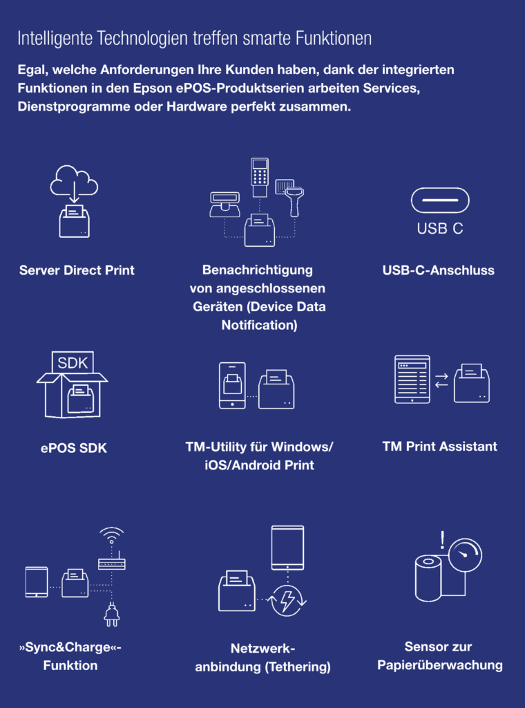 Die nachfolgenden Epson mPOS-Drucker verfügen alle über die Network Tethering-Funktion für den direkten Anschluss von Peripheriegeräten wie Scannern, Tastaturen und Waagen, die Tablet-Sync-and-Charge-Funktion (Druck und Stromversorgung eines angeschlossenen Geräts über ein einziges Kabel) sowie einen Auto-Cutter und Papiersparfunktionen, ePOS-Ansteuerung sowie SDKs für iOS und Android, USB-B, USB-Host, microSD-TSE-Slots, Ethernet; Bluetooth sowie Wi-Fi optional.